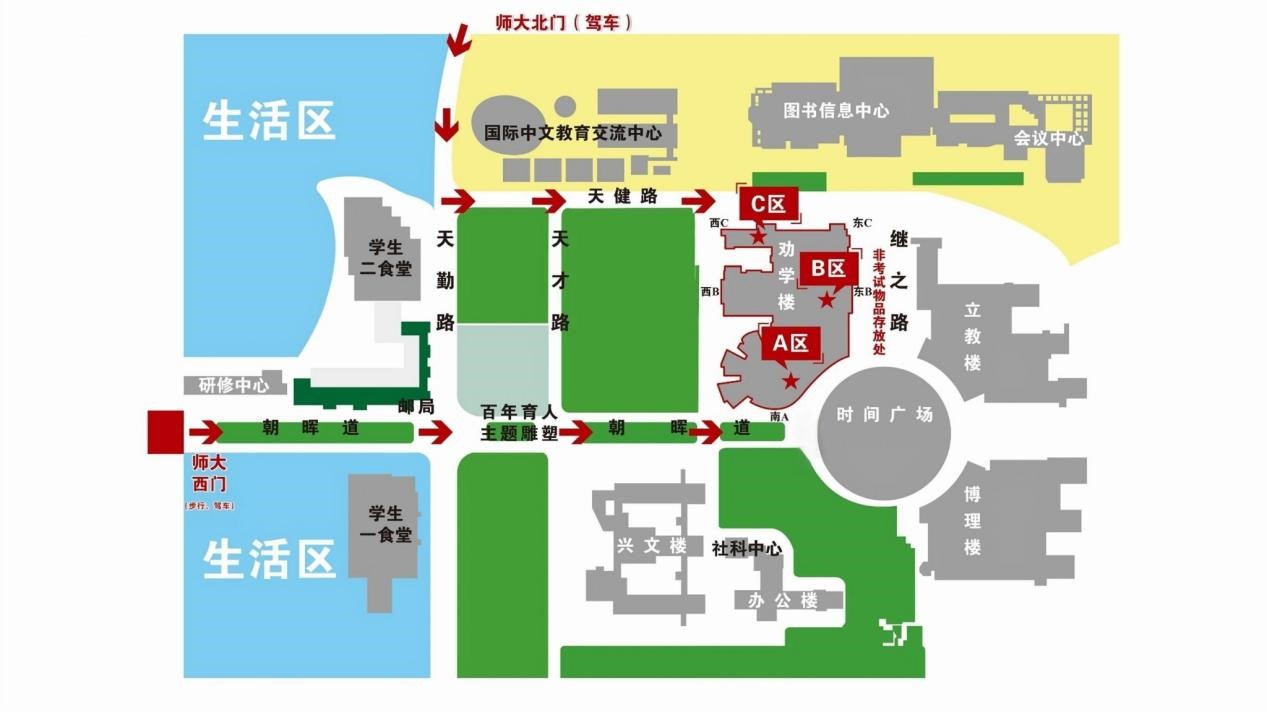 为确保校内安全,仅允许考生本人凭有效居民身份证和准考证入校。考生可通过学校西门或南门步行进入或驾驶机动车从西门或北门进入。考生进入学校后可参照考点示意图前往考场所在楼宇劝学楼,机动车停放请按照现场安保人员指引。请参考以下入校线路指引图。
